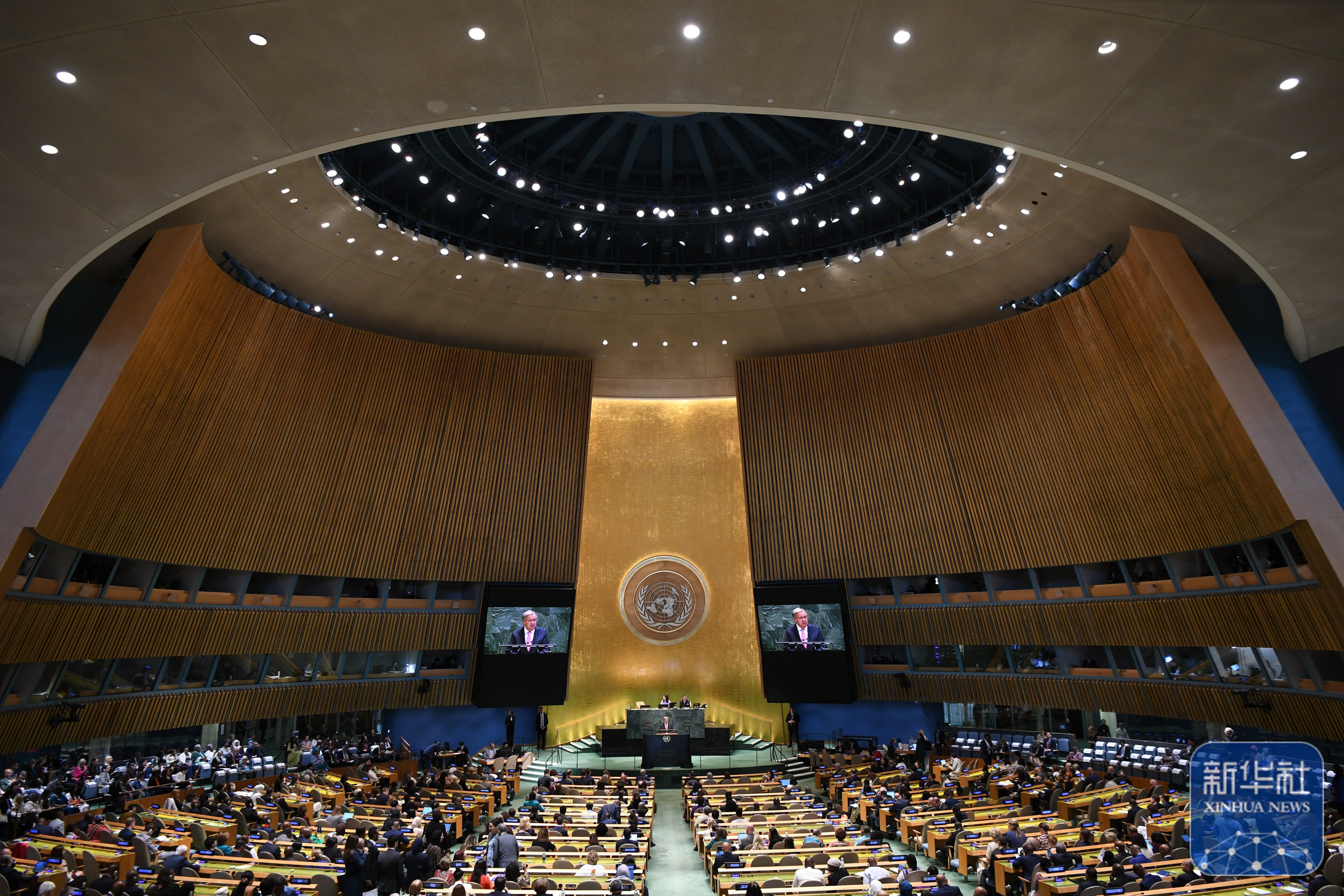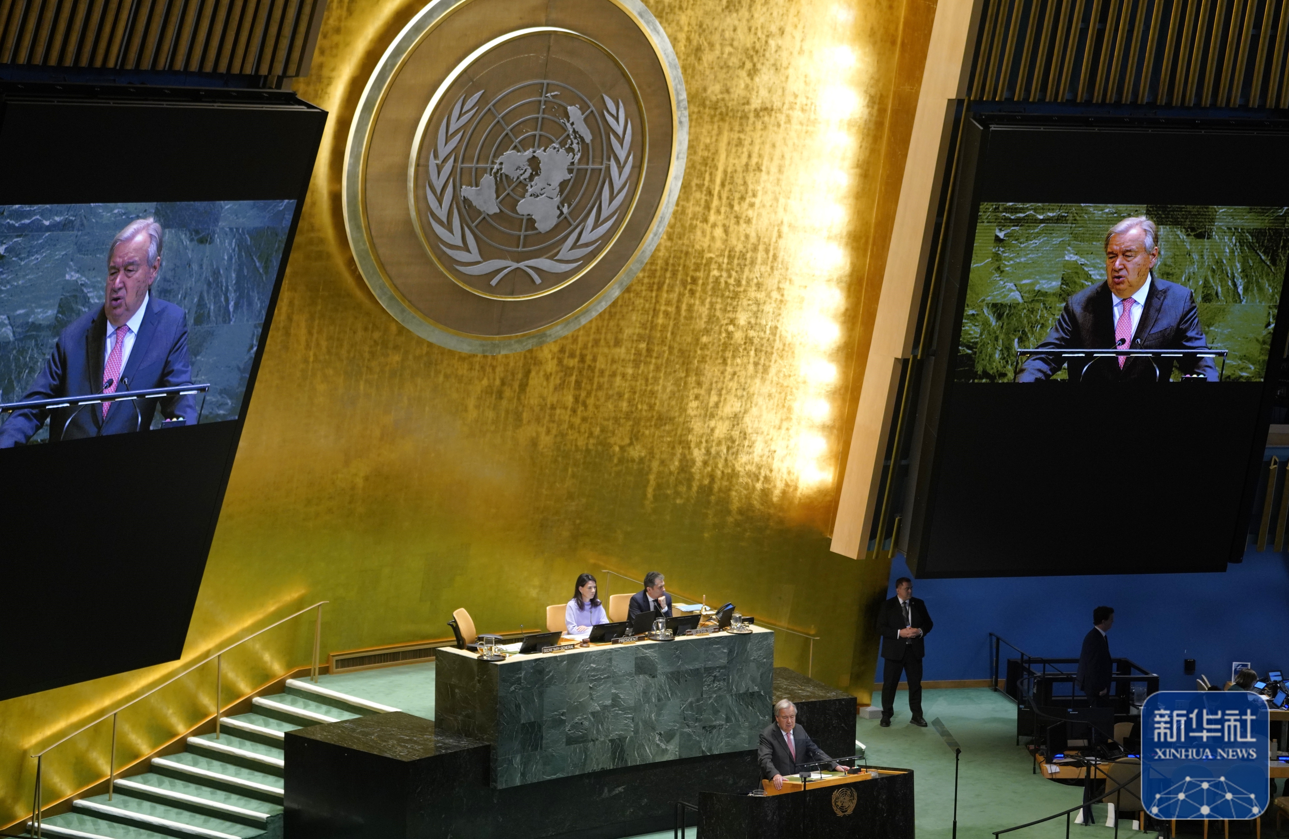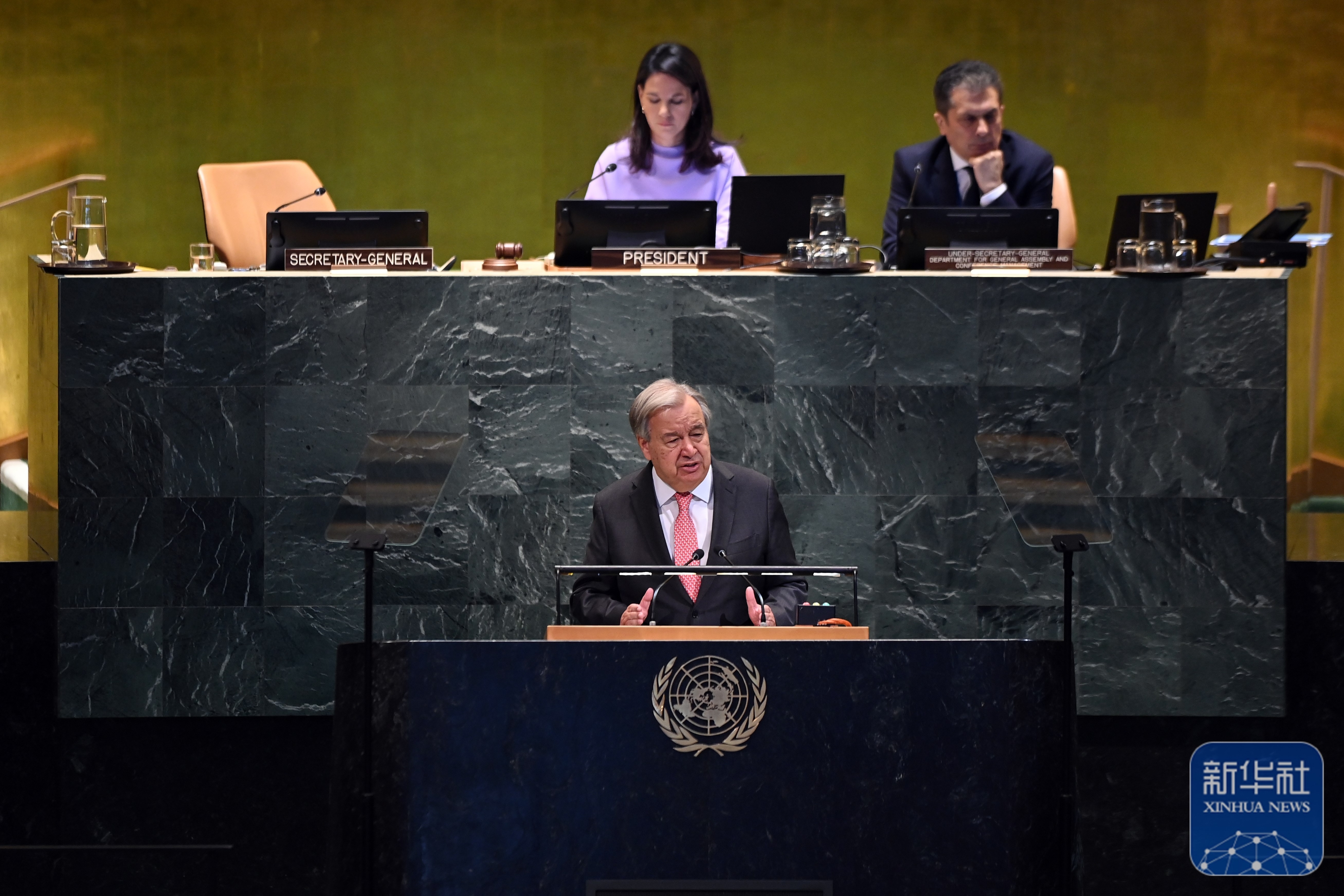 ↑9月22日,在位于纽约的联合国总部,联合国秘书长古特雷斯在纪念北京世妇会30周年高级别会议上讲话。新华社记者 吴晓凌 摄