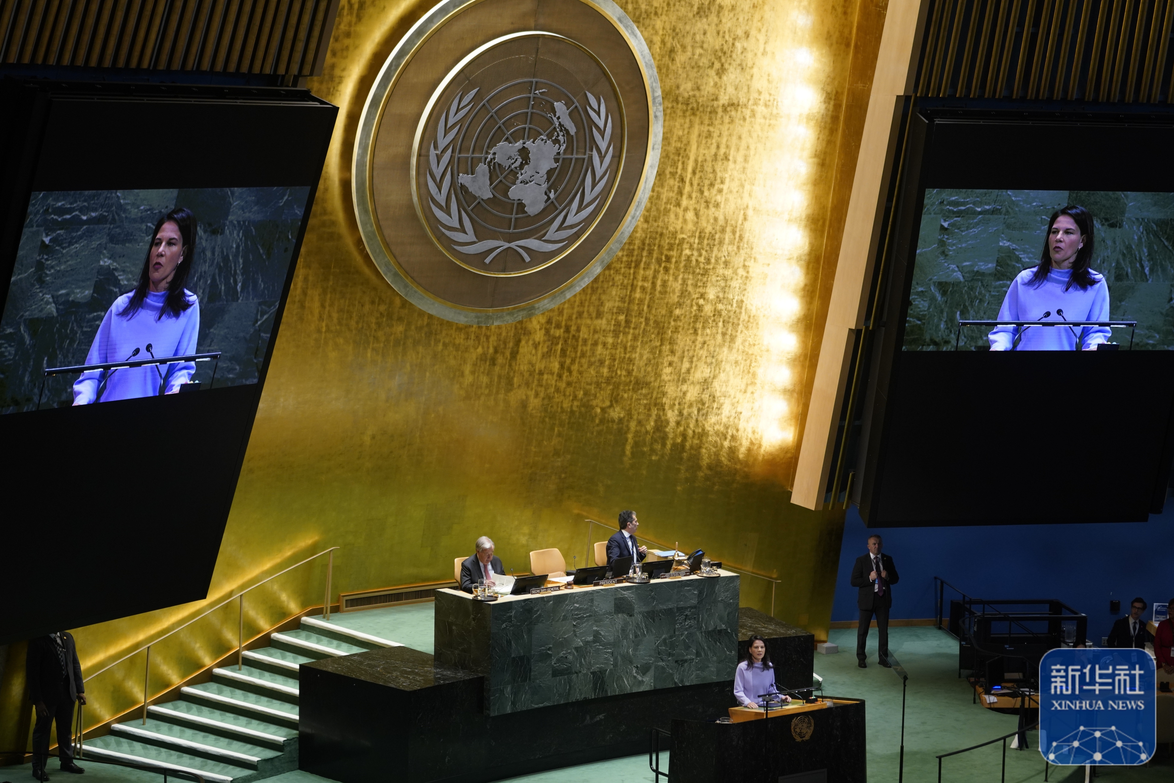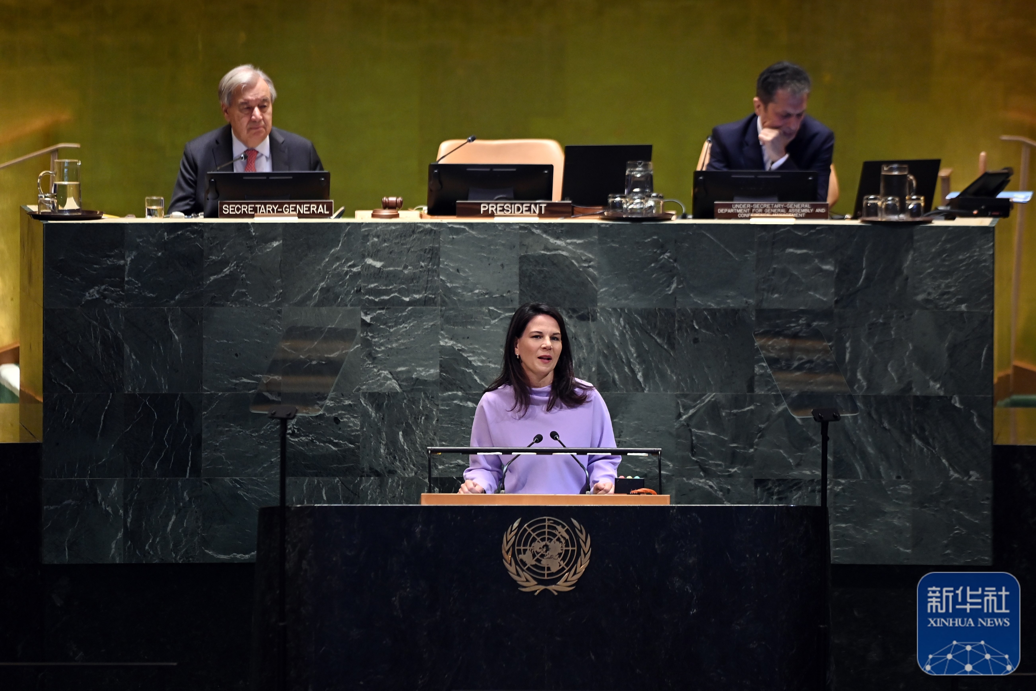 ↑9月22日,在位于纽约的联合国总部,第80届联大主席贝尔伯克在纪念北京世妇会30周年高级别会议上讲话。新华社记者 李睿 摄