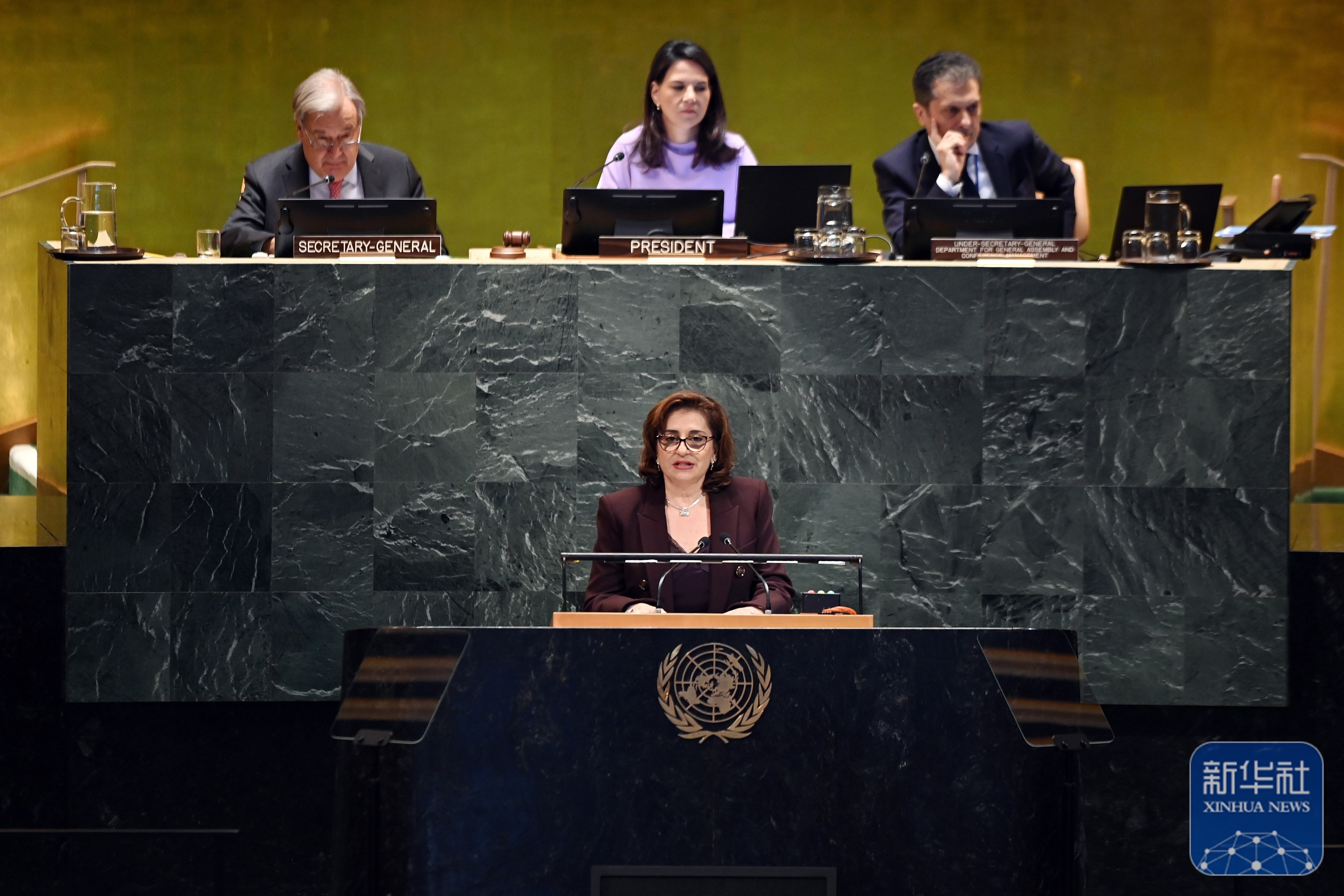 ↑9月22日,在位于纽约的联合国总部,联合国副秘书长、联合国妇女署执行主任巴胡斯在纪念北京世妇会30周年高级别会议上讲话。新华社记者 李睿 摄