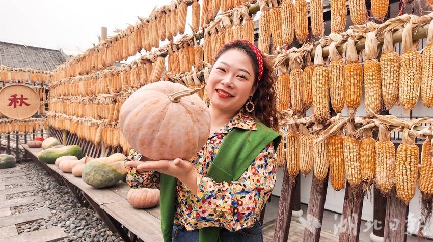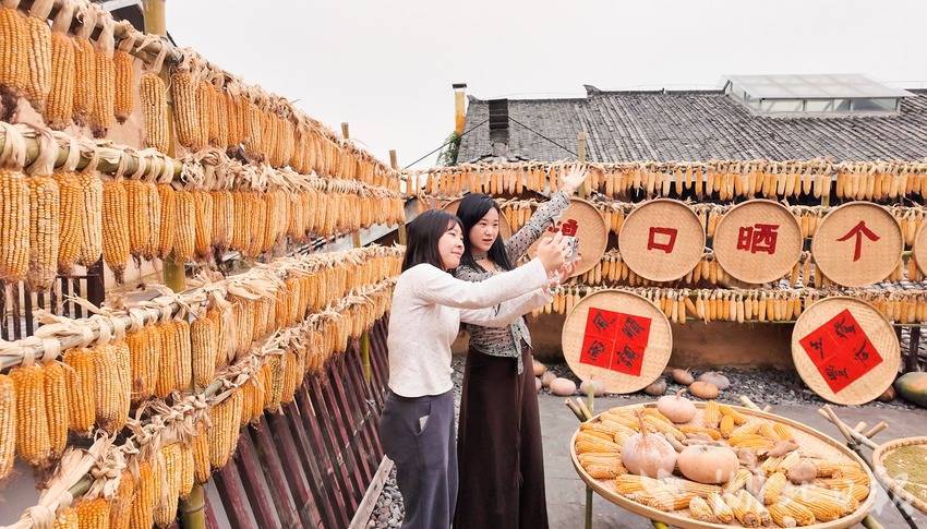 10月15日,走进该度假区喜悦酒店,庭院角落的晒秋景致格外惹眼:木质晒盘层层叠叠,搭起错落有致的“观景台”,金灿灿的玉米、红彤彤的辣椒、黄澄澄的南瓜整齐摆放,一幅生动的秋收图景跃然眼前。几位游客正举着手机,俯身、侧首,精心寻找最佳角度,将这份浓郁的秋意收入镜头。
