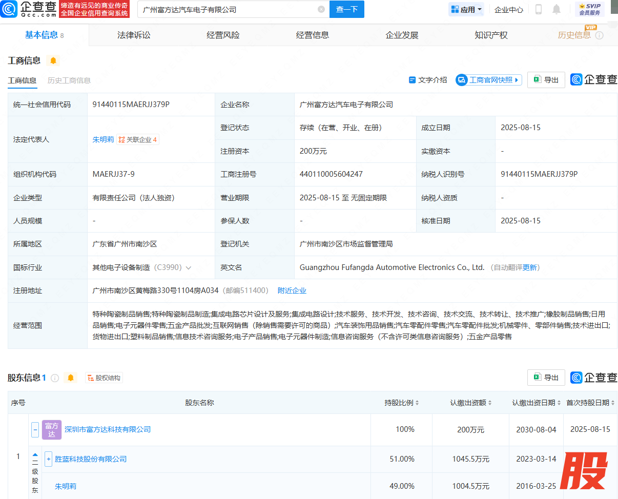 近日,广州富方达汽车电子有限公司成立,法定代表人为朱明莉,经营范围包含:特种陶瓷制品销售;集成电路芯片设计及服务;集成电路设计;电子元器件零售;五金产品批发等。企查查股权穿透显示,该公司由深圳市富方达科技有限公司全资持股,后者由胜蓝股份(300843)、朱明莉共同持股。